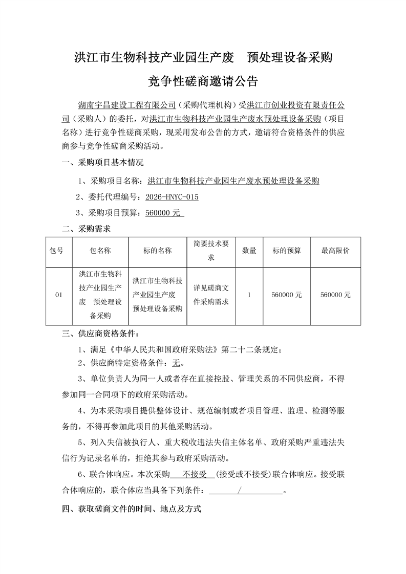 洪江市生物科技产业园生产废⽔预处理设备采购竞争性磋商邀请公告