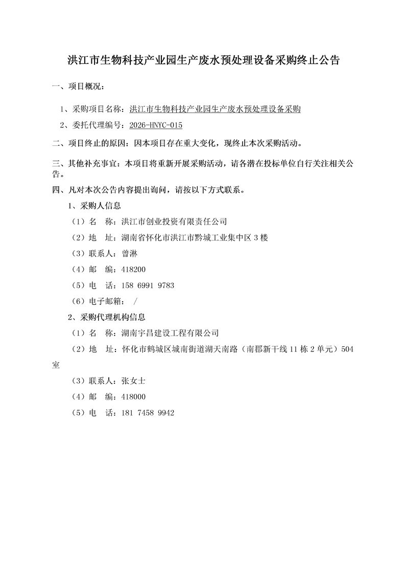 洪江市生物科技产业园生产废⽔预处理设备采购终止公告