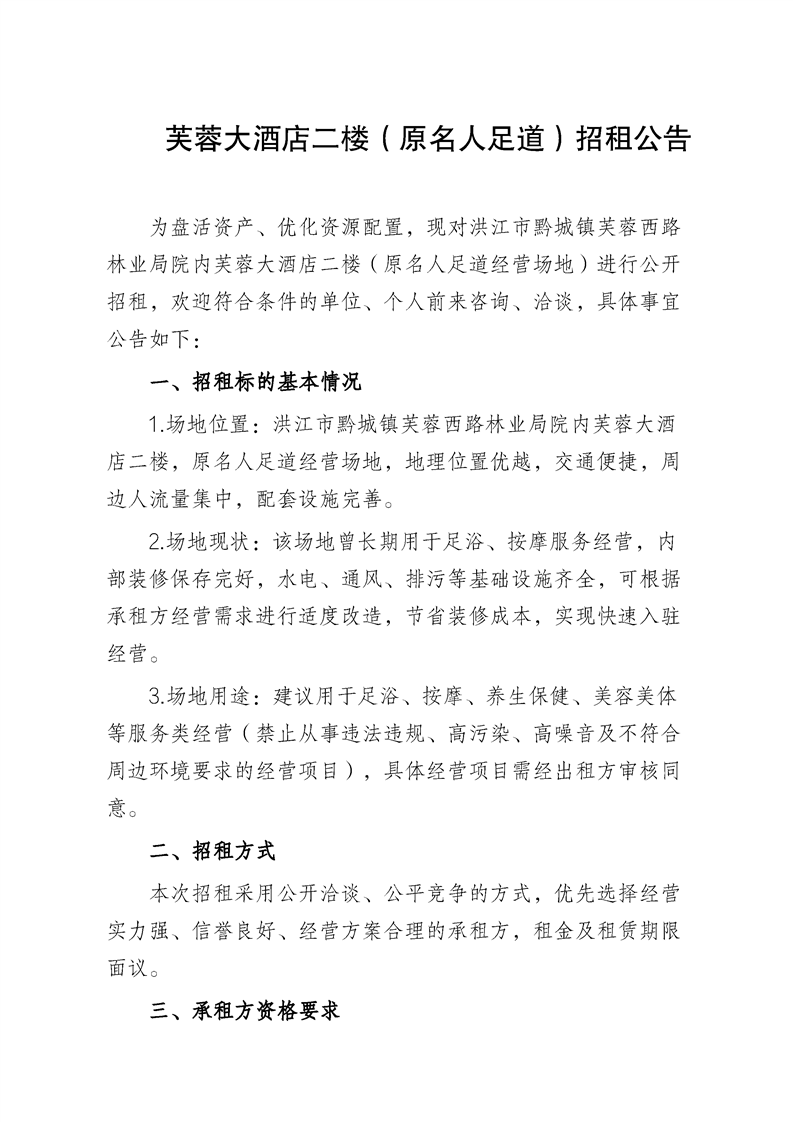 芙蓉大酒店二楼(原名人足道)招租公告