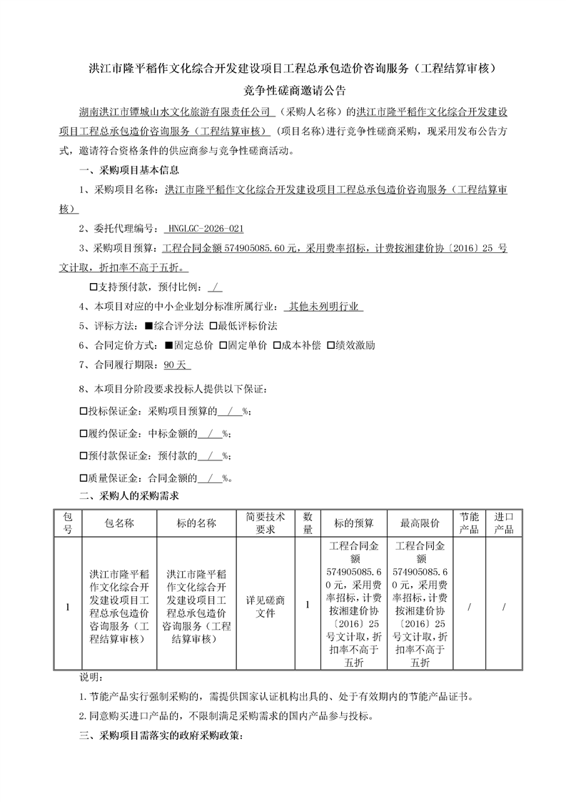 洪江市隆平稻作文化综合开发建设项目工程总承包造价咨询服务(工程结算审核)竞争性磋商邀请公告