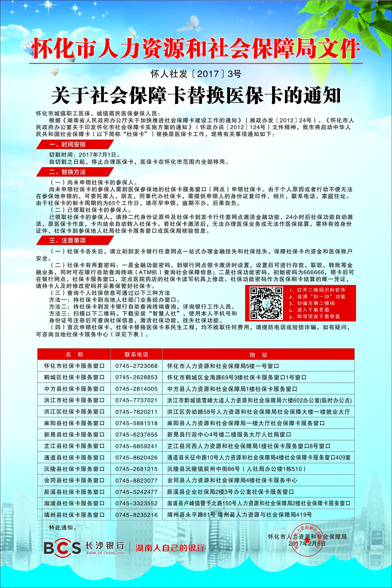 根据《关于社保卡体会医保卡的通知》(怀人社发﹝2017﹞3号)文件的要求,我市已于近日全面启动了社保卡替换医保卡的工作,为了确保职工医保和城镇居信息来源:民医保参保人员于2017年7月1日医保卡功能平稳过渡到社保卡,我市人社局拟对社保卡合作银行(农业银行、建设银行、工商银行、中国银行)和全市社区居委会工作人员进行培训,由于社保卡的办卡周期较长,需要3到4个月在省厅制卡,请未办理人员携带身份证到就近的合作银行网点或洪江市人社局社保卡服务中心(人社局六楼602办公室)尽早办理。行动不便人员可以委托他人带身份证或户口本原件代办理,首次办理不收取任何费用,如有疑问可以拨打电话:0745-7737021。
