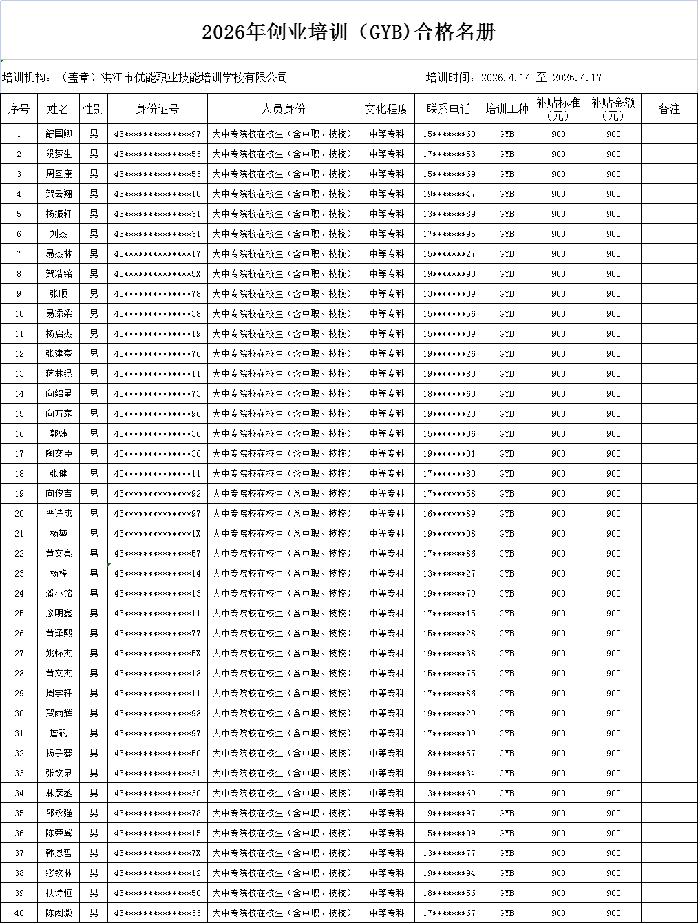 2026年创业培训(GYB)第一期合格名册