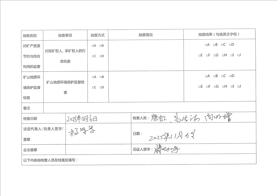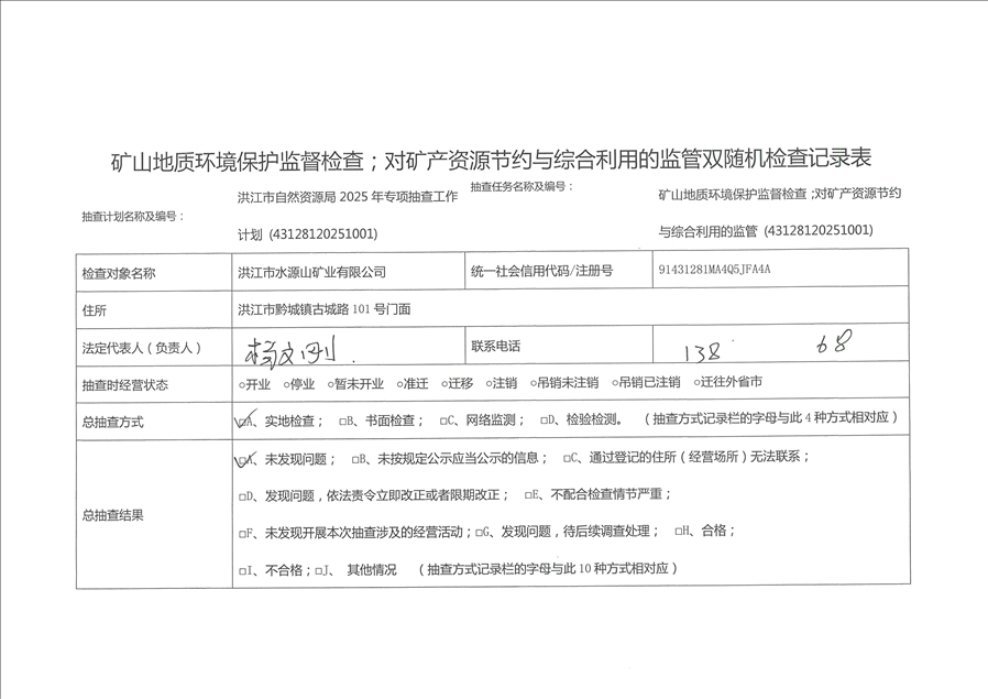双随机检查记录表(洪江市水源山矿业有限公司)