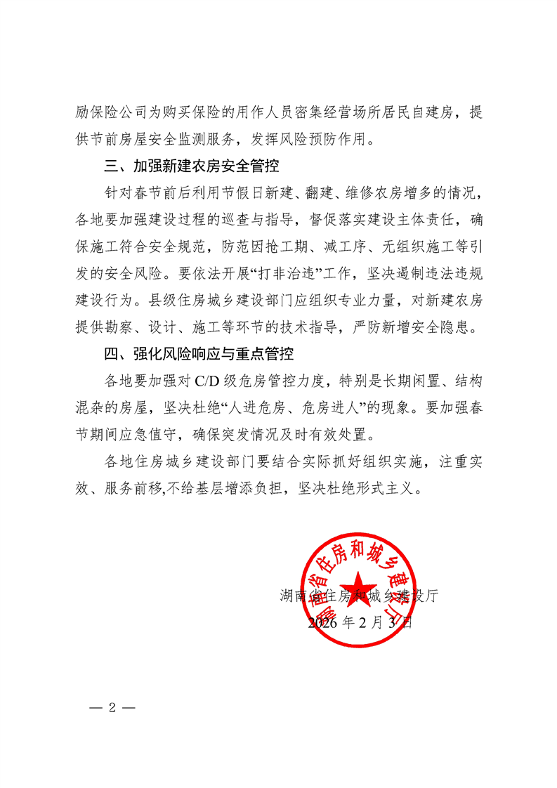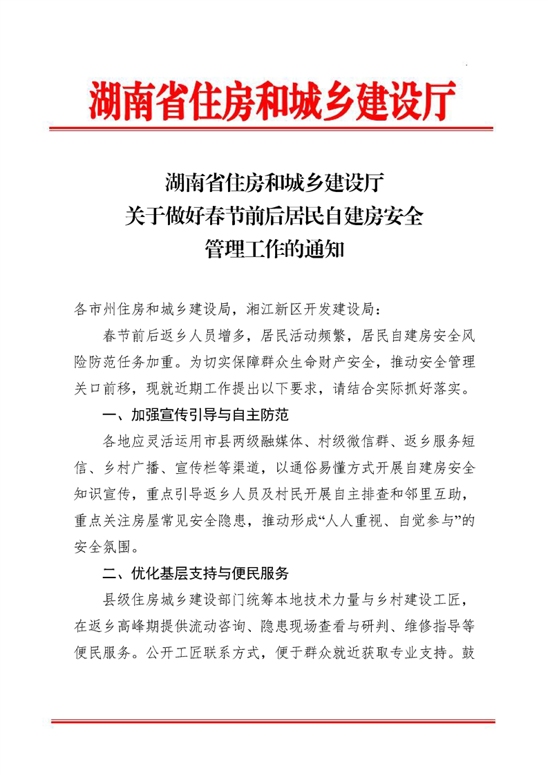 湖南省住房和城乡建设厅关于做好春节前后居民自建房安全管理工作的通知